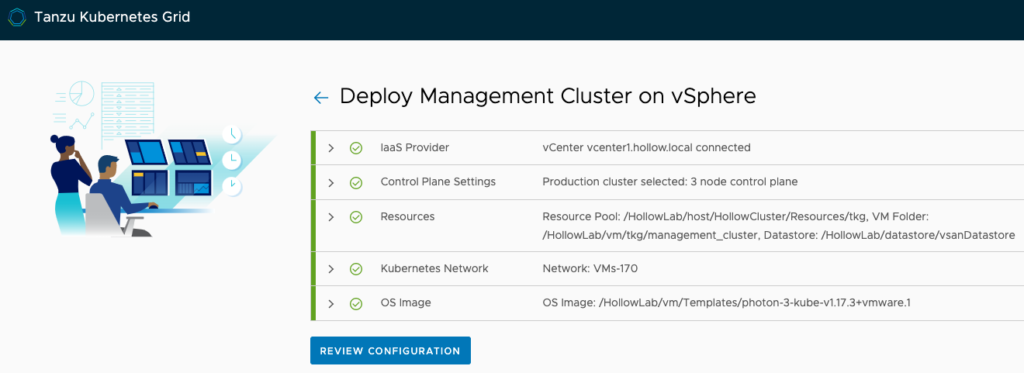 When done, you can review the configuration before deploying. After reviewing the configuration, click the “DEPLOY MANAGEMENT CLUSTER” button to being the deployment.