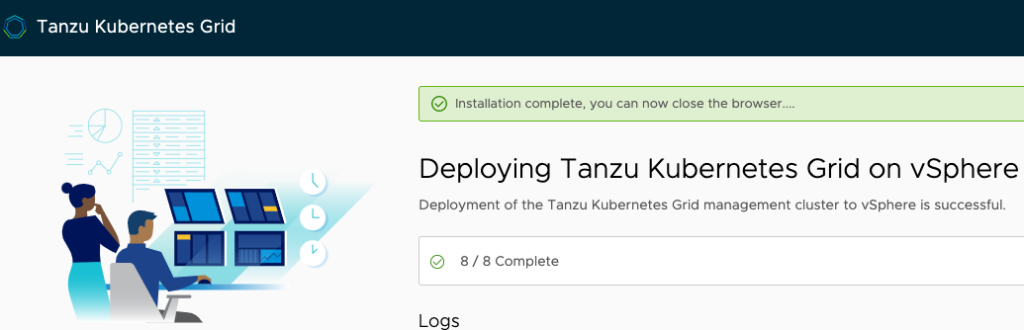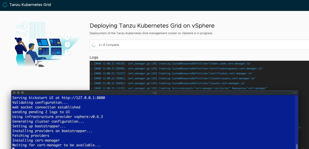 As the deployment runs, you can keep track of where you are, but looking at either the web browser which shows the running logs, or the terminal where you initial ran the tkg init command.