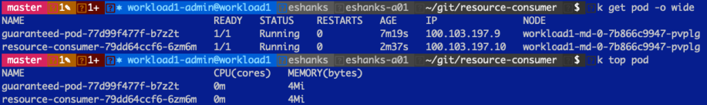 OK, next, I’ve deployed two pods into my Kubernetes cluster and those pods are on the same worker node for a simple example about contention. I’ve got a guaranteed pod that has 1000m CPU set as a limit but also as a request. The other pod is unbounded, meaning there is no limit on how much CPU it can utilize.