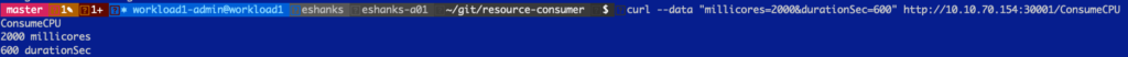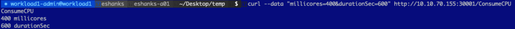 Ok, now that we’ve seen the “no load” state, lets add some CPU load by making a request to the pod. Here, I’ve increased the CPU usage on the container to 400 millicores.