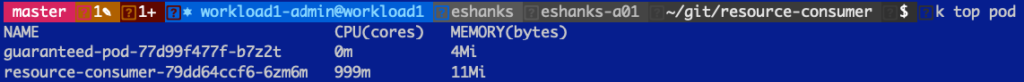 And if we look at the containers resources you can see that even though my container wants to use 2000m CPU, it’s only actually using 1000m CPU. The reason for this is because the guaranteed pod is guaranteed 1000m CPU, whether it is actively using that CPU or not.