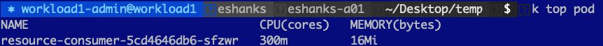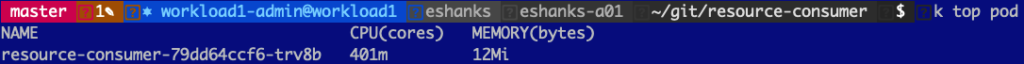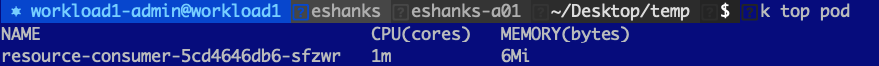 Lets try out using a CPU limit on a pod and see what happens when we try to request more CPU than we’re allowed to have. Before we set the limit though, lets look at a pod with a single container under normal conditions. I’ve deployed a resource consumer container in my cluster and be default, you can see that I’m use 1m CPU(cores) and 6 Mi(bytes) of memory.