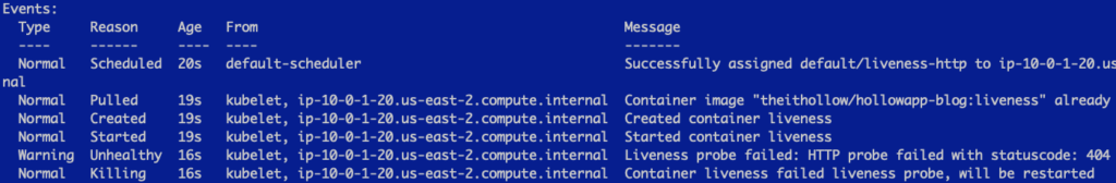 We can see that the liveness probe is failing if we run a describe on the pod.