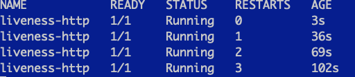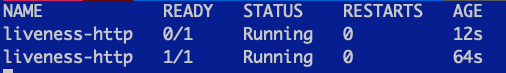 As a silly example, what if we modified our liveness probe to look for /health? Perhaps we have an application that sometimes stops working, but doesn’t crash. Will the application ever startup? Here’s my new probe in the yaml manifest.