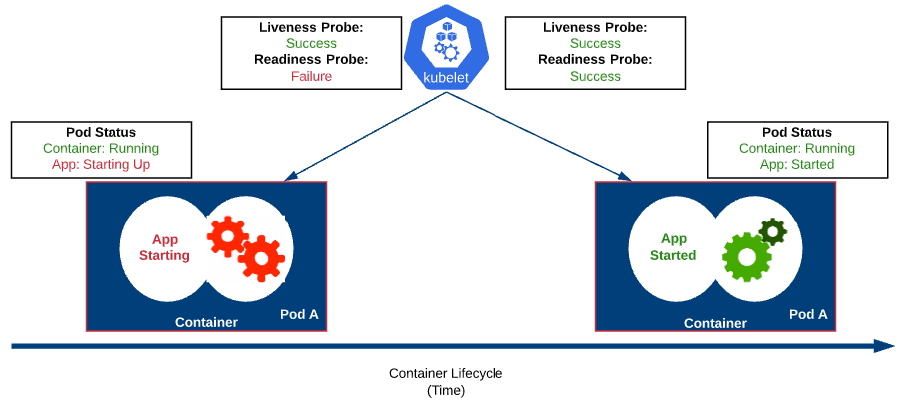 On the left side, the pod has just been deployed. A liveness probe performed at TCPSocketAction and found that the pod is “alive” even though the application is still doing work (loading data, etc) and isn’t ready yet. As time moves on, the application finishes its startup routine and is now “ready” to serve incoming traffic.