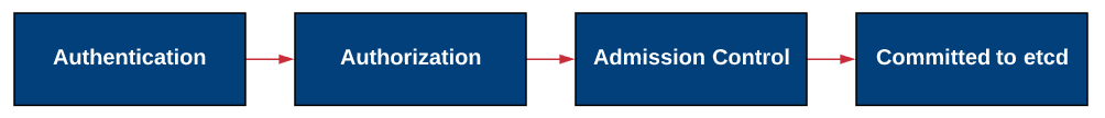 A generalized request flow for new objects starts with Authenticating with the API, then being authorized, and then optionally hitting an admission controller, before finally being committed to the etcd store.