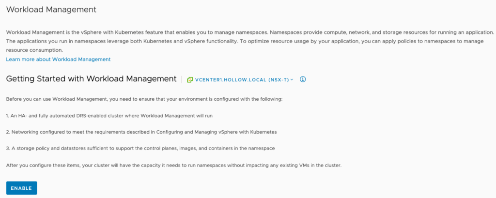 This post focuses on enabling the workload management components for vSphere 7 with Kubernetes. It is assumed that the vSphere environment is already in place and the NSX-T configuration has been deployed.