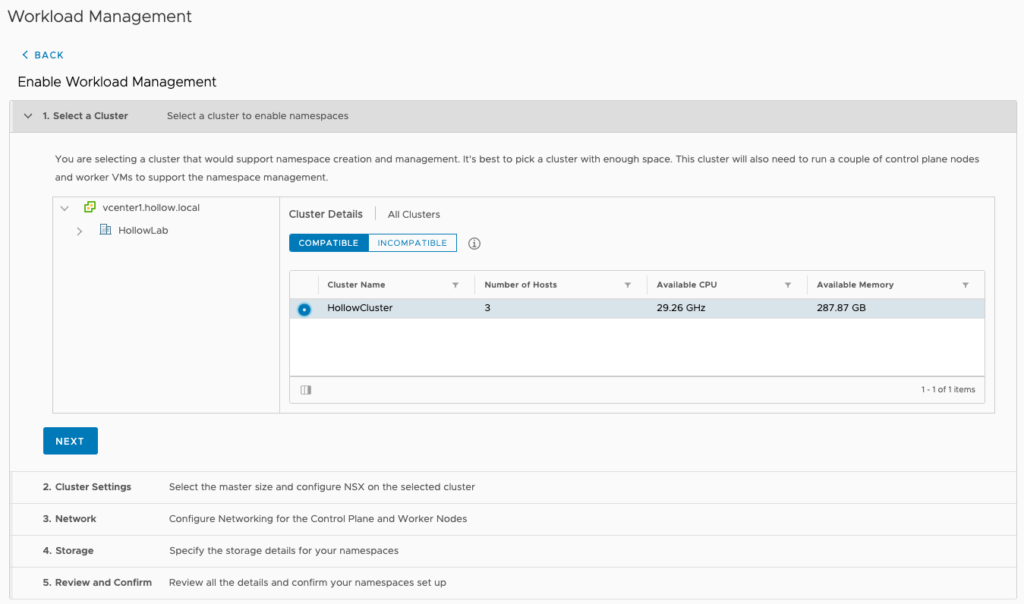 The first screen in the wizard, will list your compatible vSphere clusters. These clusters must have HA and DRS enabled in fully automated mode. If you are missing clusters, make sure you have ESXi hosts on version 7 with HA and DRS enabled. You’ll also need a Distributed switch on version 7 for these clusters.