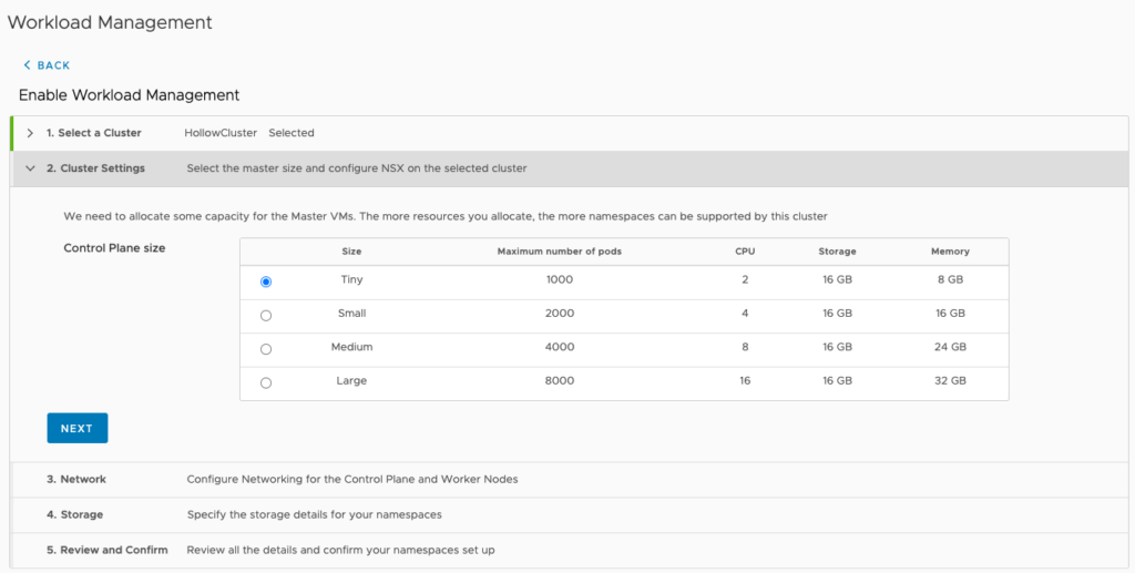 Next, you must select a control plane size. This defines the VM size of the control plane nodes for your Kubernetes clusters. Since I have limited resources in my lab, I’ve chosen the Tiny size.