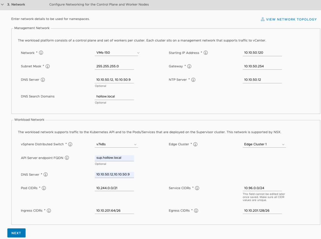Once you’re through with the management network, its time to configure the workload network. Select the Distributed switch that will be used, and the Edge cluster. Next enter an API Server endpoint DNS name. This will be associated with the first “Starting IP Address” IP created in the management network (So 10.10.50.120 in this example). You will want to add a DNS entry for this FQDN. The Pod CIDRs and Service CIDRs should be fine, but you can change this if you’d like. Lastly, you need to enter Ingress and Egress CIDRs. This IP Address range should come from your external network. In my case this is VLAN 201. I’ve carved two /26s aside for ingress/egress access.