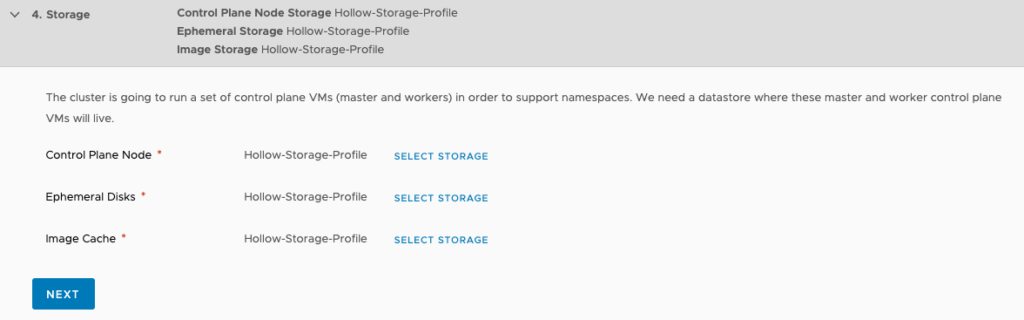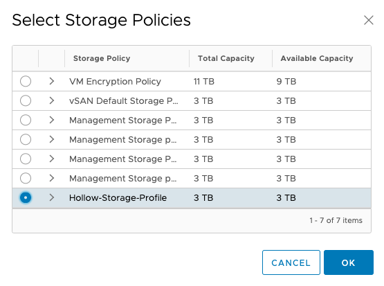 For each of these objects you’ll need to select a storage policy that defines what datastores are compatible. I created a Hollow-Storage-Profile policy as a pre-requisite that selects my vsanDatastore. Select the storage profile configured for each of these components.