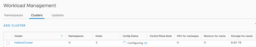 As the configuration is running, you can view some minimal status information in the clusters screen. You can see here it’s configuring.
