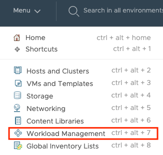 To enable workload management, login to your vCenter as the [email protected] account. Then in the Menu, select Work