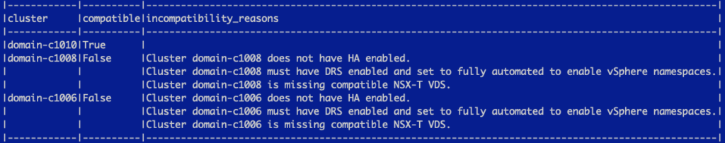 You can see why two of my vSphere clusters are incompatible from running the command above. If you have more trouble with enabling “workload management” I recommend reading this post from William Lam.