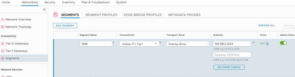 Go to Networking –> Segments and then click the ADD SEGMENT button to create a new segment. Fill out the name, and select the T1 router created earlier. Then select the Overlay dropdown and enter the Subnet CIDR for this segment. Then click Save.