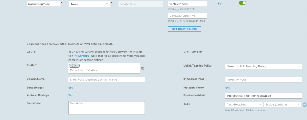 We want to create one more segment for our future Tier-0 router to use to connect to our physical network. I’m naming my segment Uplink-Segment and it belongs to the VLAN-Zone transport zone.