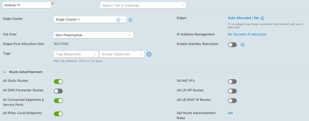 To setup your first Tier-1 router go to the Networking –> Tier-1 Gateways page and click ADD TIER-1 GATEWAY BUTTON. Give the router a name and select the edge cluster from the drop-down. Under route advertisement, enable All Static Routes, and All Connected Segments and Service Ports. For now, this is really all that needs to be done. We’ll revisit this at a later time.