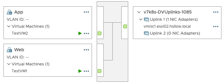 After deploying these segments, I connected a virtual machine to Web and App segments to test connectivity between them. The result was a successful ping between VMs on different segments and in vCenter, you can see the portgroups for those new segments.