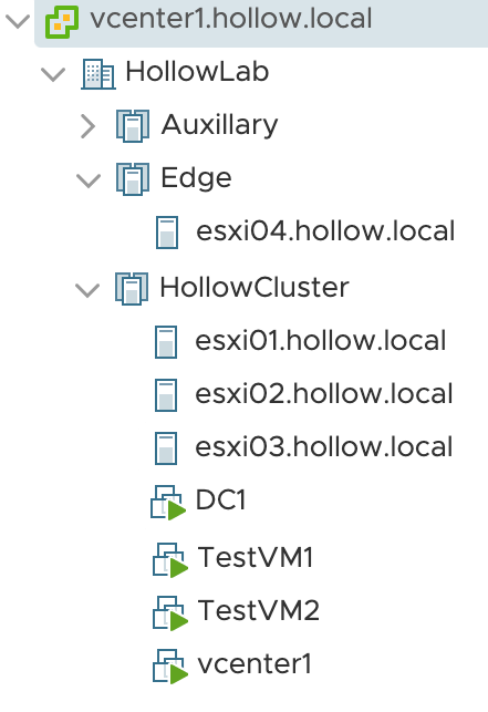I have a three node hollowlab cluster that I’ll use to host my workloads and general purpose VMs. This cluster must have vSphere HA turned on, and VMware Distributed Resource Scheduler (DRS) enabled in Fully Automated mode. This means that you’ll need to have vMotion working between nodes in your workload cluster. HA and DRS are requirements for vSphere 7 with Kubernetes clusters. More details about size/speed/capacities are found here.