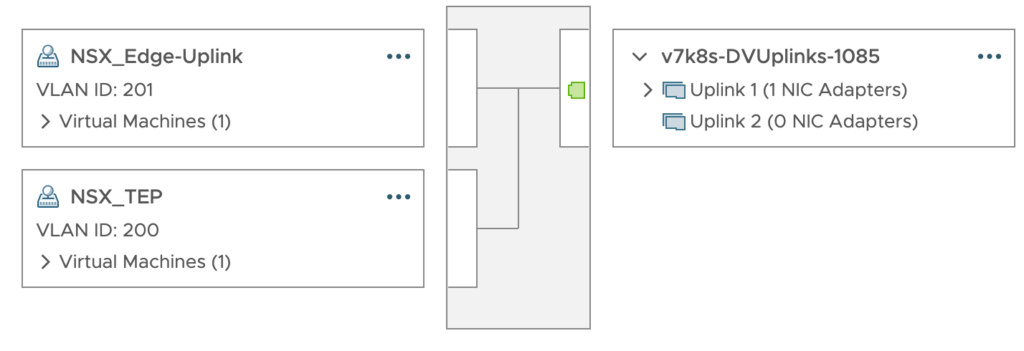 For the NSX components, I’ve deployed a single vSphere 7 distributed switch (VDS) across both my workload cluster and the edge cluster. I’ve created two portgroups on the VDS which will be used by the edge nodes deployed later in the series.