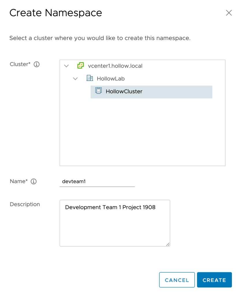 On the first screen select which Supervisor Cluster to create the namespace, then give it a name and a description. Then click Create.