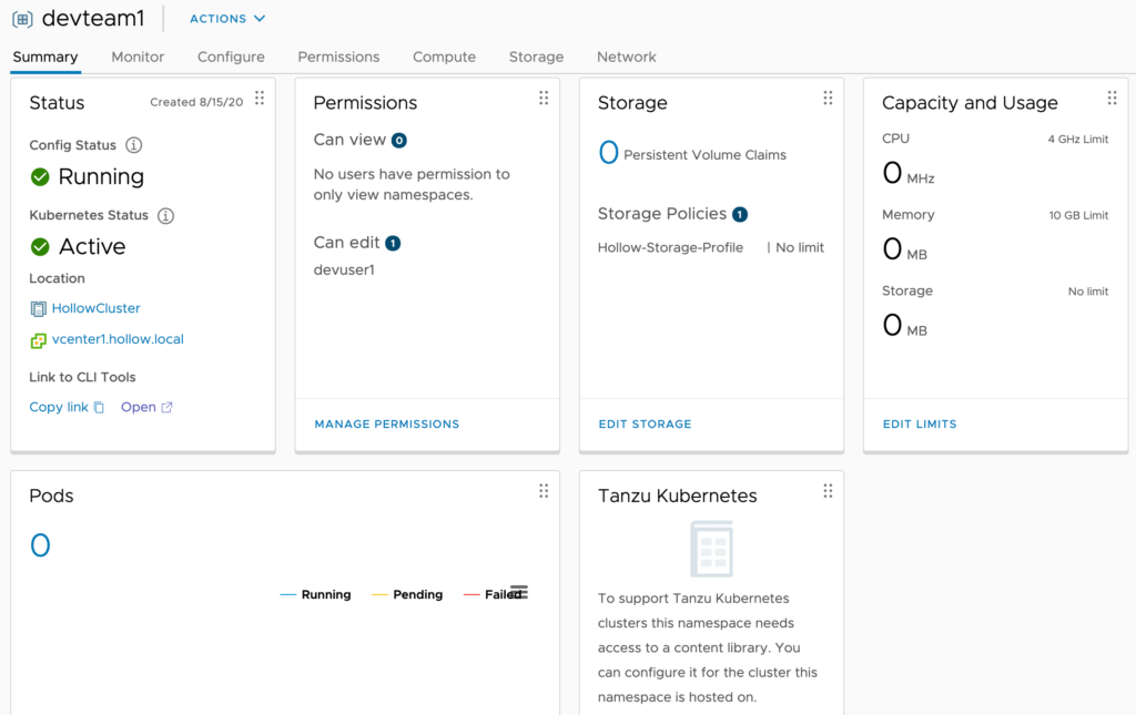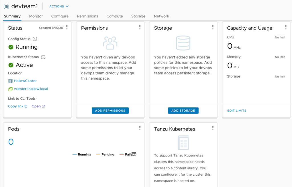 Supervisor Namespaces are a way to isolate resources, assign role based access controls, and allocate physical resources for your users. Stay tuned for the next post when we login to the Supervisor Cluster within this namespace.