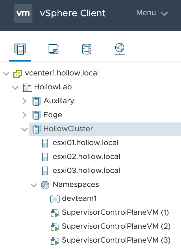 And you’ll notice the namespaces are also listed under the “Hosts and Clusters” view if you’re logged in as [email protected], very similar to a resource pool would look.