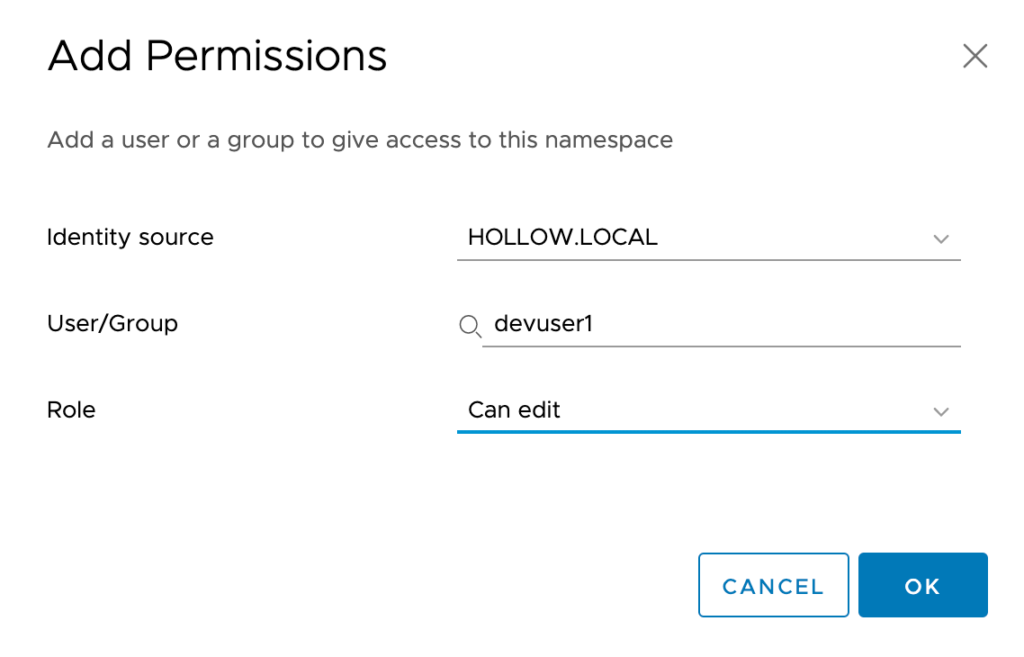 You can see a couple of buttons on that overview screen. Let’s set some permissions so that some of our users can use this namespace soon. Click the App Permissions button within the “Permissions” tab. Select your identity source, a user or a group from that source, and either view or edit permissions. I’ve used edit permissions so we can use this user in later posts. Click OK.