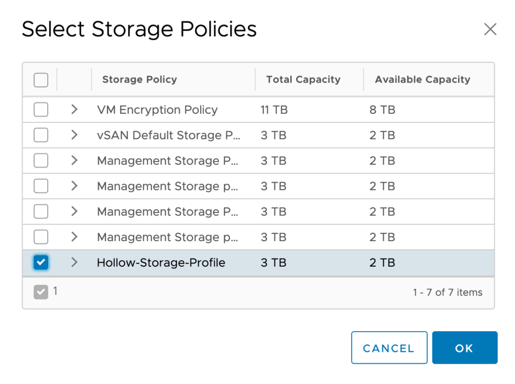 The last setting we’ll do in this post is the Add Storage button in the Storage tab. Here you’ll select a storage policy that can be used with this namespace. These are standard storage policies that can be used on vsphere datastores to select the correct ones.
