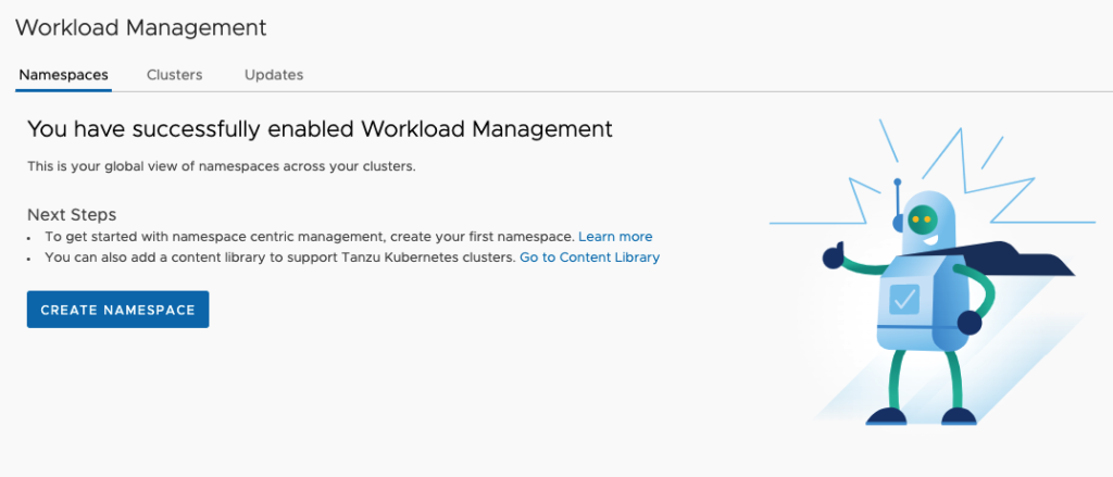 Within the Workload Management menu, select the Namespaces tab. If this is your first namespace, you’ll be greeted with a fancy splash page with the robot thingy on the right side. Sorry, I don’t know it’s name, but it really should have one..)