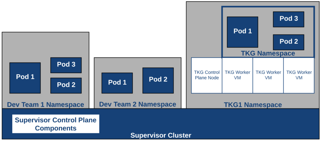 To better illustrate things, the diagram below demonstrates that you can carve up the Supervisor Cluster to suit your needs. The diagram below has two namespaces for two different Development teams (you could carve these up by project, app, or whatever you’d like, dev teams is just an example). Those two namespaces would have different permissions so one development team couldn’t see the pods/resources in the other namespaces. They are also sized differently.