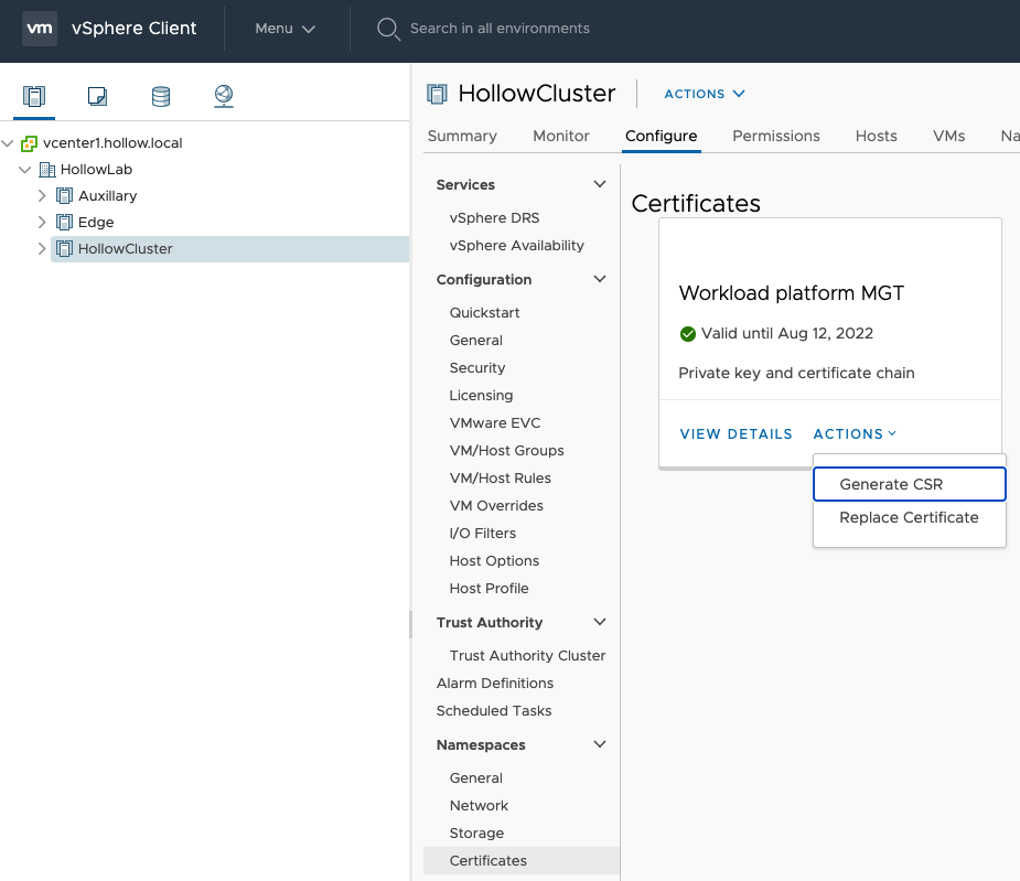 One last note. At this point you’re authenticating to the Kubernetes API Endpoint using a non-trusted certificate because we specified the --insecure-skip-tls-verify switch at login. We can use an existing CA to sign new certificates and use them. We may cover this in another post, but the location to generate a cert request is found in Supervisor Cluster –> Configure –> Namespaces –> Certificates –> Workload platform MGT.
