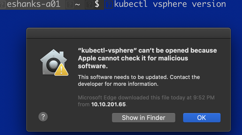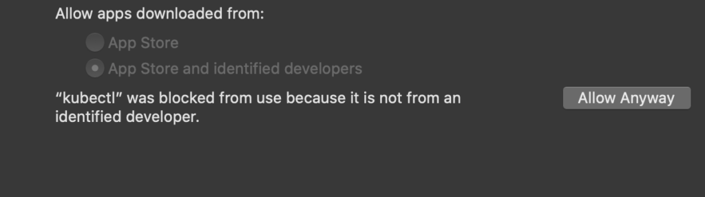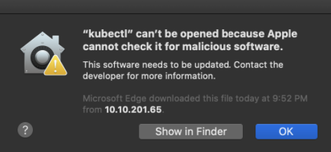 To verify that the CLIs are working, open a shell session and run the command: kubectl version just to see if the CLI will respond with the version. In my case, running it gave me a security error that I needed to fix because Apple couldn’t check it for malicious software.
