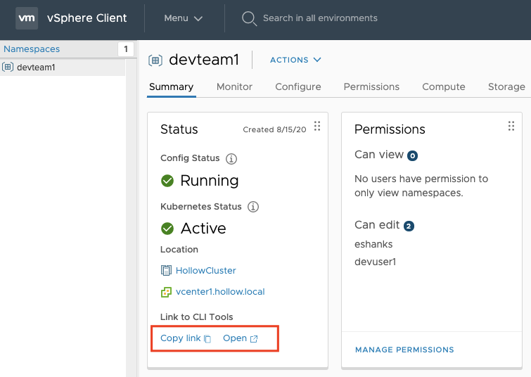 First, login to vCenter again with the [email protected] account and navigate to the namespace that was previously created. You should see a similar screen where we configured our permissions. In the Status tile, click one of the links to either open in a browser or copy the URL to then open in a browser.