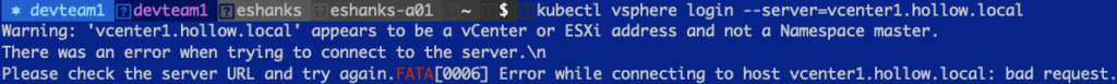 NOTE: I found the instructions a tad confusing. The Kubernetes API Endpoint webpage shows --server which I initially mistook for the vCenter server. It’s really asking for the Kubernetes API endpoint. In the screenshot below, you’ll see what happens if you use the wrong address, which was a helpful error message.
