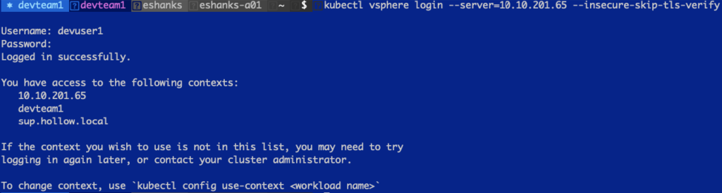 In the last post we created a namespace within the Supervisor Cluster and assigned some resource allocations and permissions for our example development user. Now it’s time to access that namespace so that real work can be done using the platform.