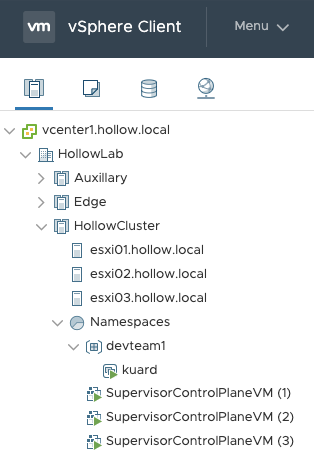 If you login to vCenter as the [email protected] user, you will even see the pod running in vCenter, under our namespace in the Hosts and Clusters view.