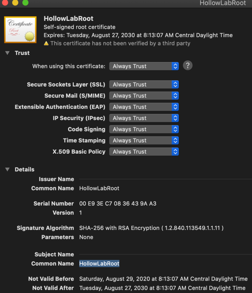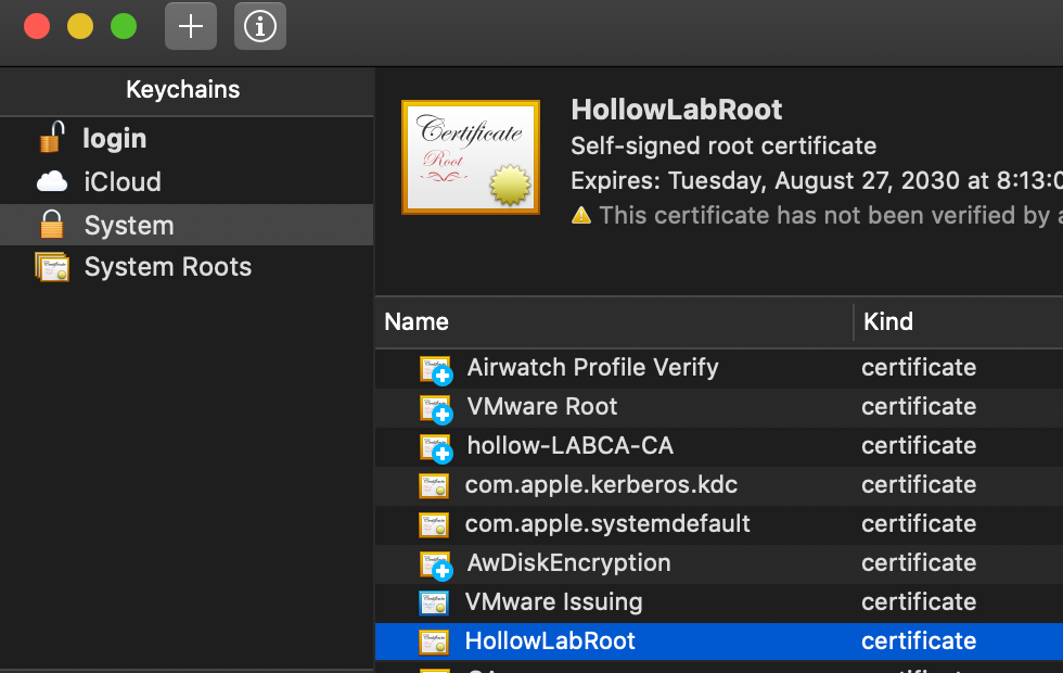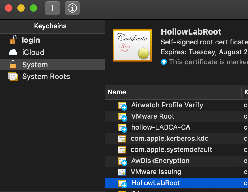 When you finish, there should be a little blue checkmark next to the certificate demonstrating that it’s trusted. Now, any certificates signed by this root certificate, will be automatically trusted by this workstation.