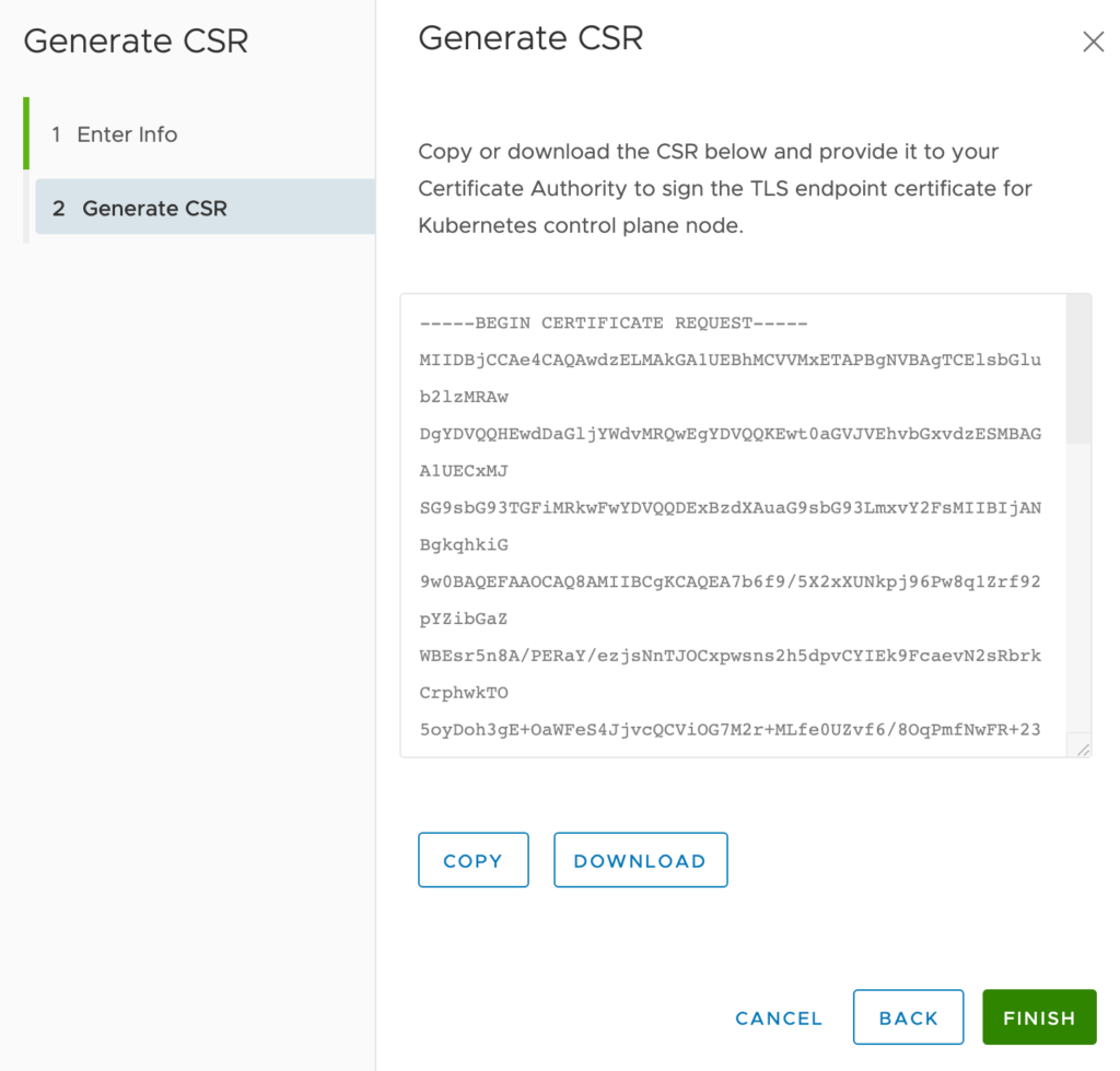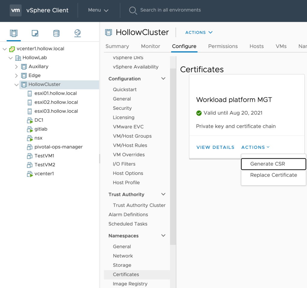 In the vCenter UI, navigate to the Supervisor Cluster that you’ve created and click the Configure tab and then the Certificates menu item. You should see a Workload platform MGT tile. Under Actions click Generate CSR.