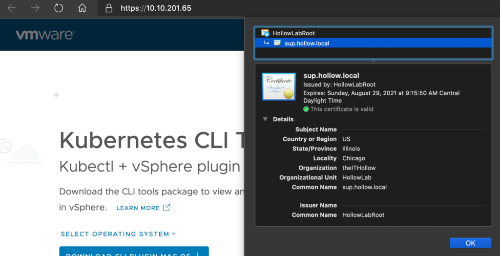 In this post you created your own root certificate, generated a certificate signing request from vCenter, and then signed that certificate request with your root CA. Lastly you replaced the VMware certificate with your own and tested to validate you can access the Kubernetes API Endpoint without using the insecure-skip-tls-verify option. It feels good to get rid of those certificate warnings doesn’t it?