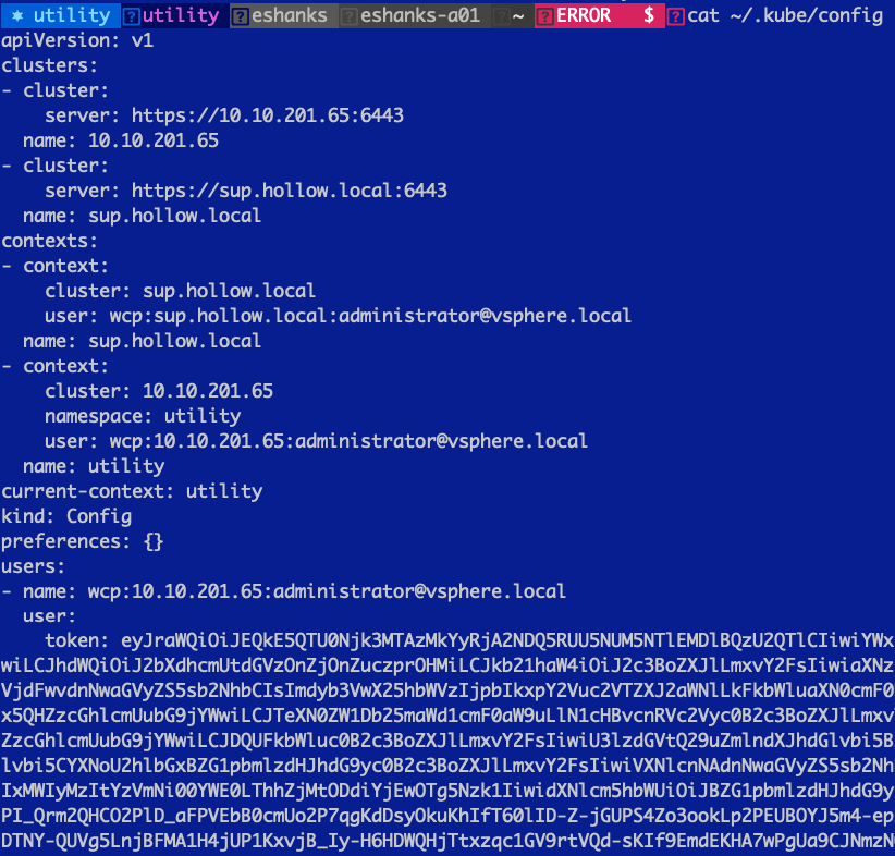 If we take a look at that config file, we see that we’ve got our supervisor cluster configuration information listed here. The name, IP Addresses, certificates, etc. The only real problem here is the token. The JWT token expires every 10 hours by default. This means, that this KUBECONFIG file is going to be useless in 10 hours.