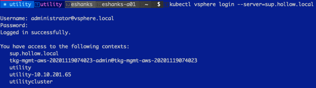 Typically you’d login to your TKG clusters through the kubectl cli with a command like: