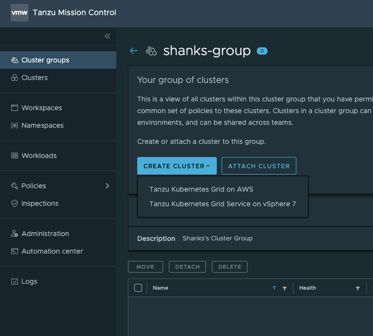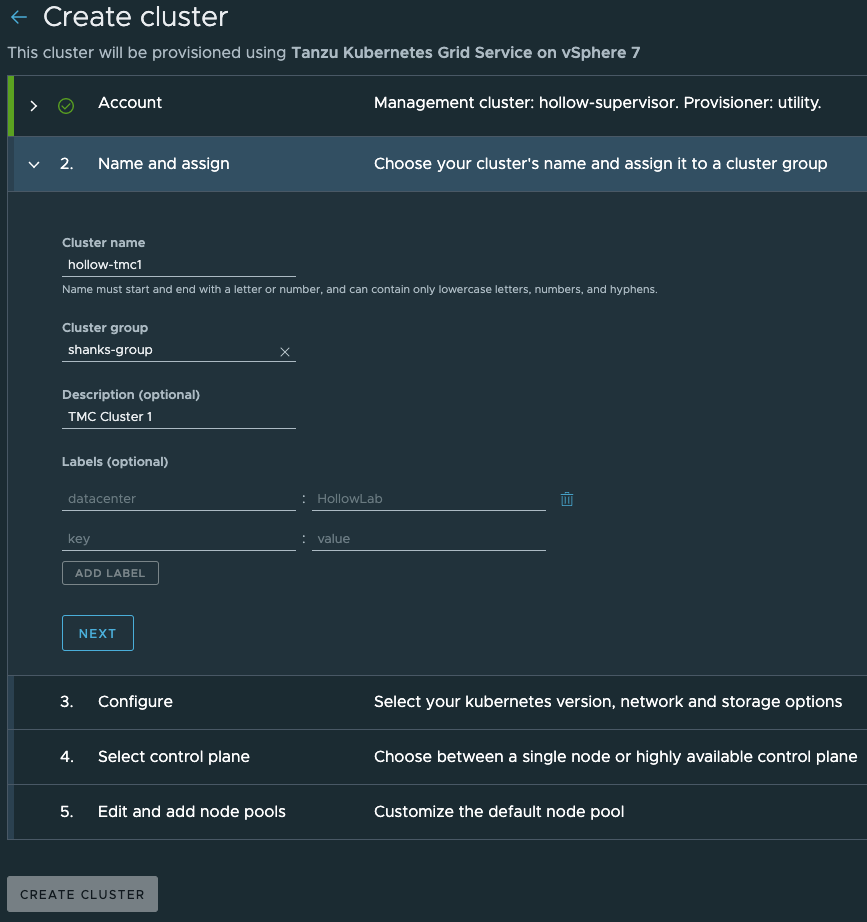 Now define your Cluster details. Names, descriptions, and labels. But also select a TMC cluster group. Cluster Groups often have TMC policies for enforcing controls across groups of clusters. Using groups and policies, is a simple way to apply security or governance policies to fleets of clusters.