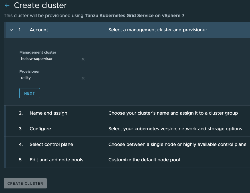 Login to your TMC account and go to the Clusters tab. Click the CREATE CLUSTER button where you’ll now see a drop down. Select Tanzu Kubernetes Grid Service on vSphere 7.