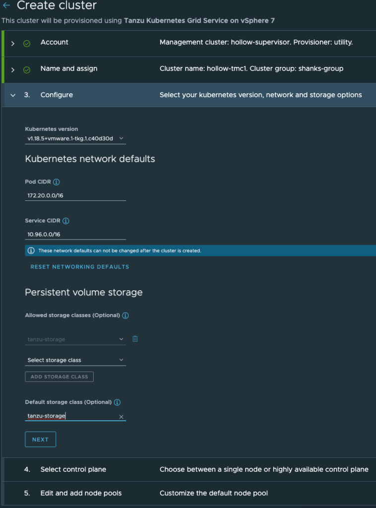 The next screen asks some cluster configuration questions such as the pod/service CIDRs, and what storage classes to use. Those storage classes come from your configured supervisor cluster and are presented as a drop down.