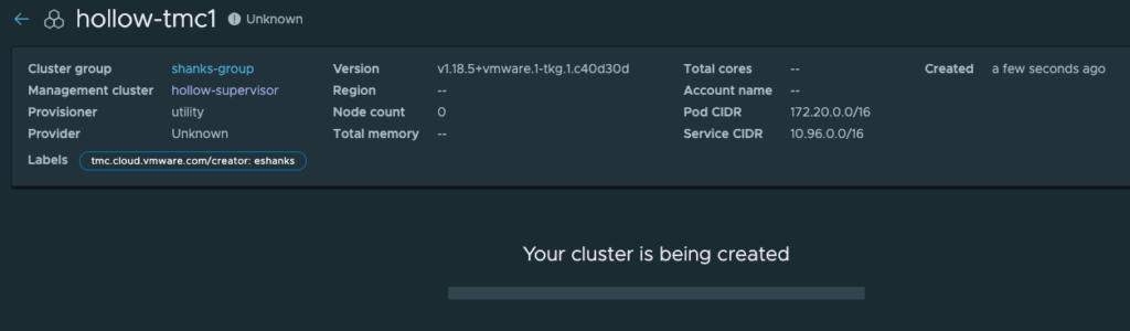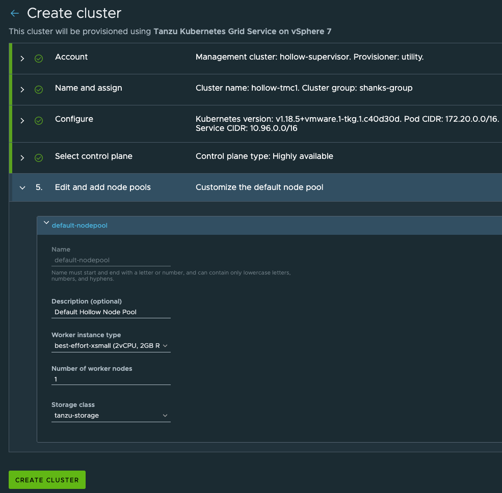 tmc cluster create --management-cluster-name hollow-supervisor --provisioner-name utility --cluster-group shanks-group --high-availability --name hollow-tmc1 --version v1.18.5+vmware.1-tkg.1.c40d30d --template tkgs --storage-class tanzu-storage --worker-instance-type best-effort-xsmall --instance-type best-effort-xsmall