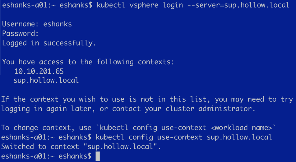 Once you’ve created a yaml file from the template above and placed your base64 encoded certificate string into it, you’ll need to switch to the Supervisor cluster’s context and apply it. Login to your Supervisor cluster context.