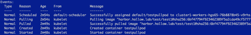 Login to the Tanzu Kubernetes Cluster (TKC) if you haven’t already, and then switch your Kubernetes context to this TKC. Deploy a pod from an image located in the registry and you should be able to successfully download the image.
