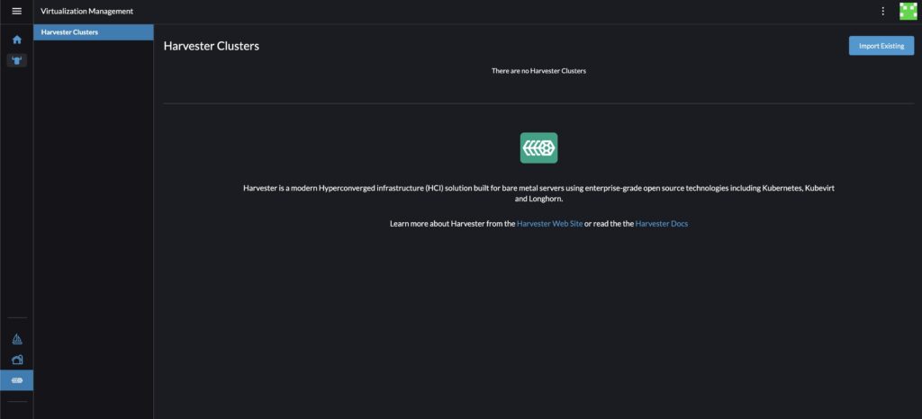 Login to your Rancher server. If you installed Rancher like I did, the login page will give you instructions on retrieving the admin password. This comes down to running a docker command or a Kubernetes command depenging on how you installed it. Login and go to the Virtualization Management tab and then the click " Import Existing" button.