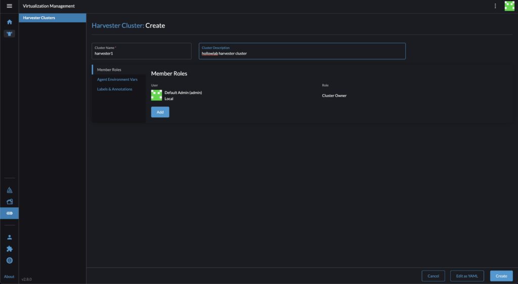 During the previous posts in this series, we deployed a Harvester cluster, setup virtual networks to segment traffic, and deployed our first virtual machine. So far this has been a pretty good experience, but most of my day job requires me to do a lot of work on containers so I’d like to have Kubernetes clusters at home. Of course I could deploy a bunch of VMs for a new Kubernetes cluster, but Harvester is built on top of Kubernetes already. So this post will show us how we can connect Rancher to our Harvester cluster so we can use the underlying Kubernetes cluster that Harvester runs on to run our own containers.
